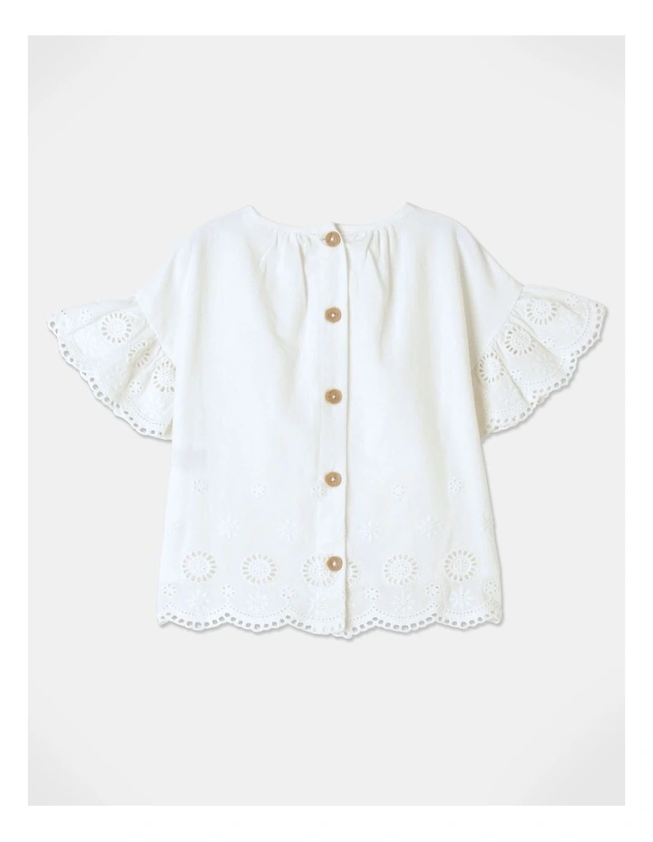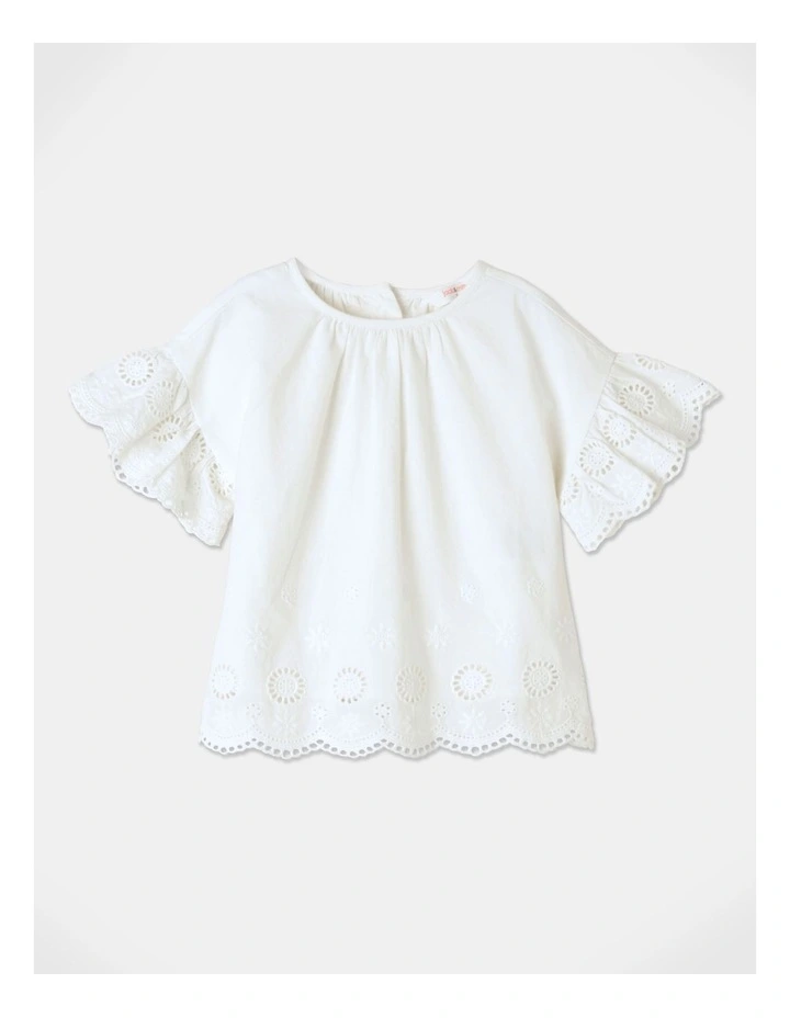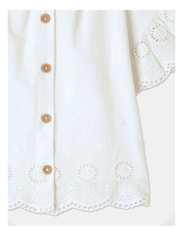 - Shirring at shoulders with scallop edge frill sleeves